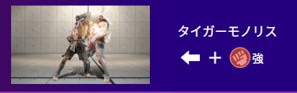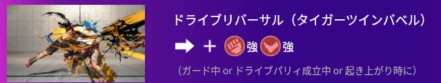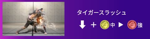 DR (中P+中K 右右) > 屈中K > タイガーモノリス(4強P) > 中タイガーキャノン > DR (中P+中K 右右) > 屈中P > 強P > 強タイガーニー